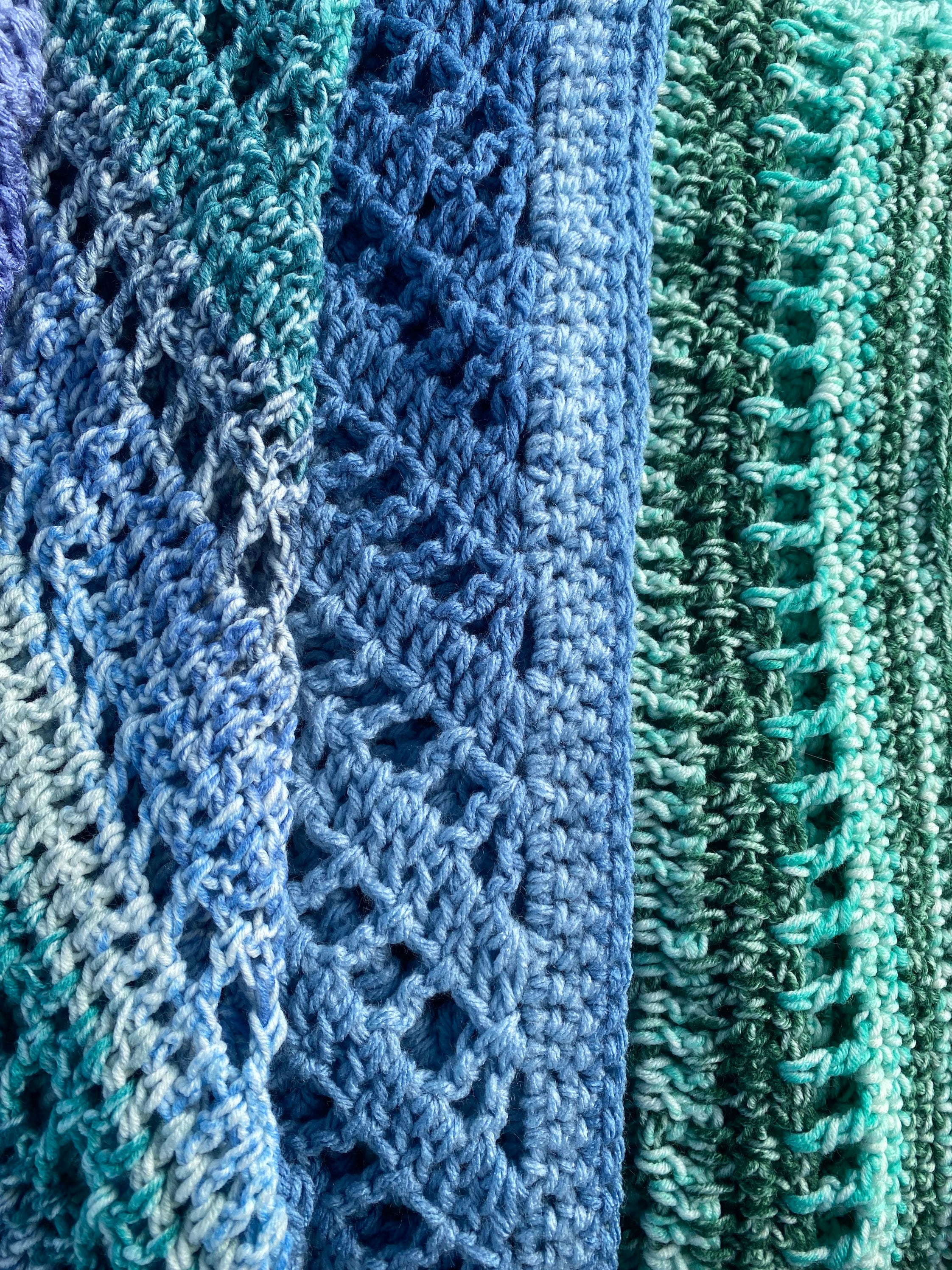 Made with mandala brand yarns in the colors Zen (greens), Harmony (jean/ denim blues), Mantra (blues with a hint of green), cool forid (greys), chi (purples), nifflers (neon rainbow), diagon alley (pastel rainbow).