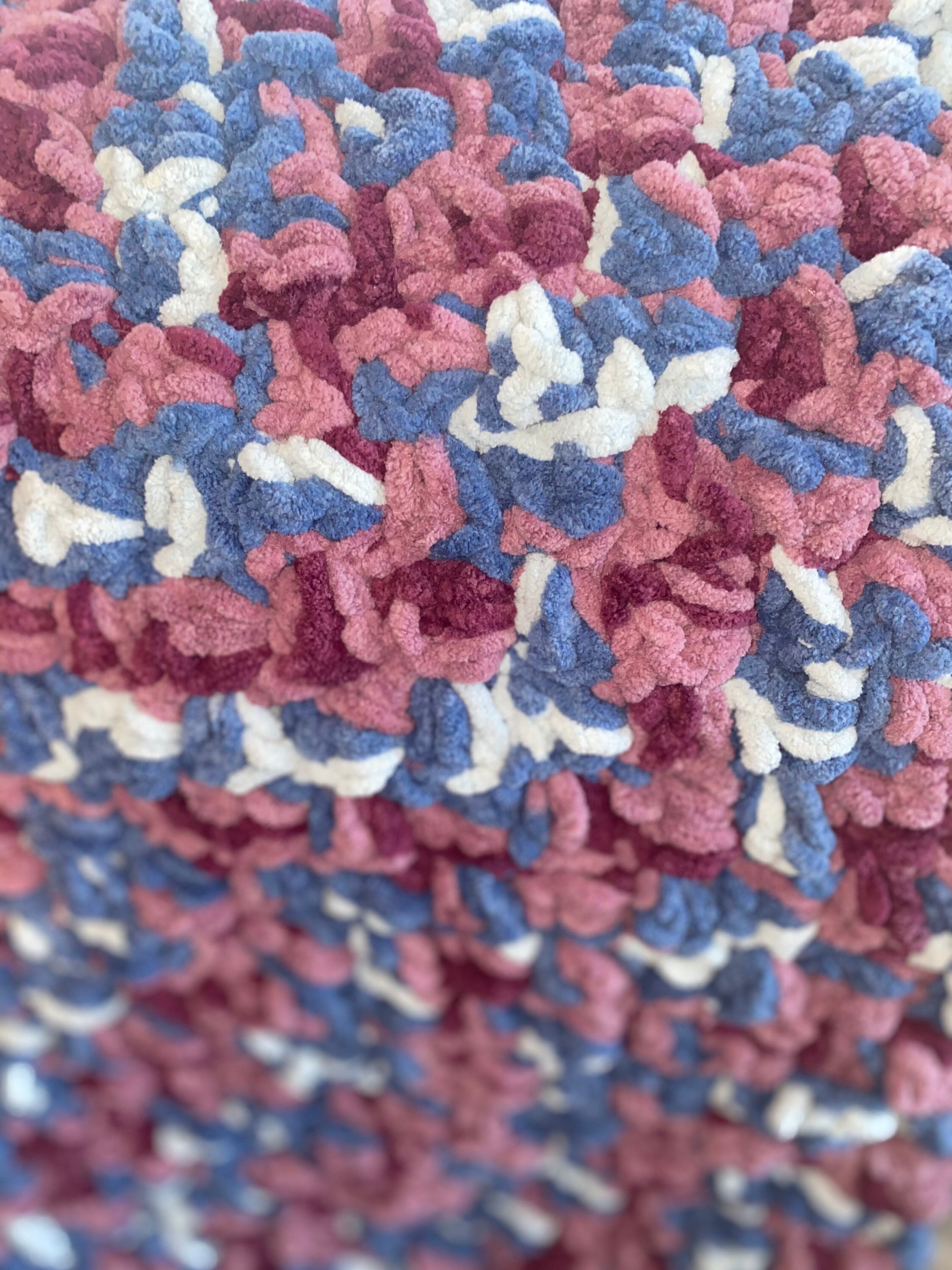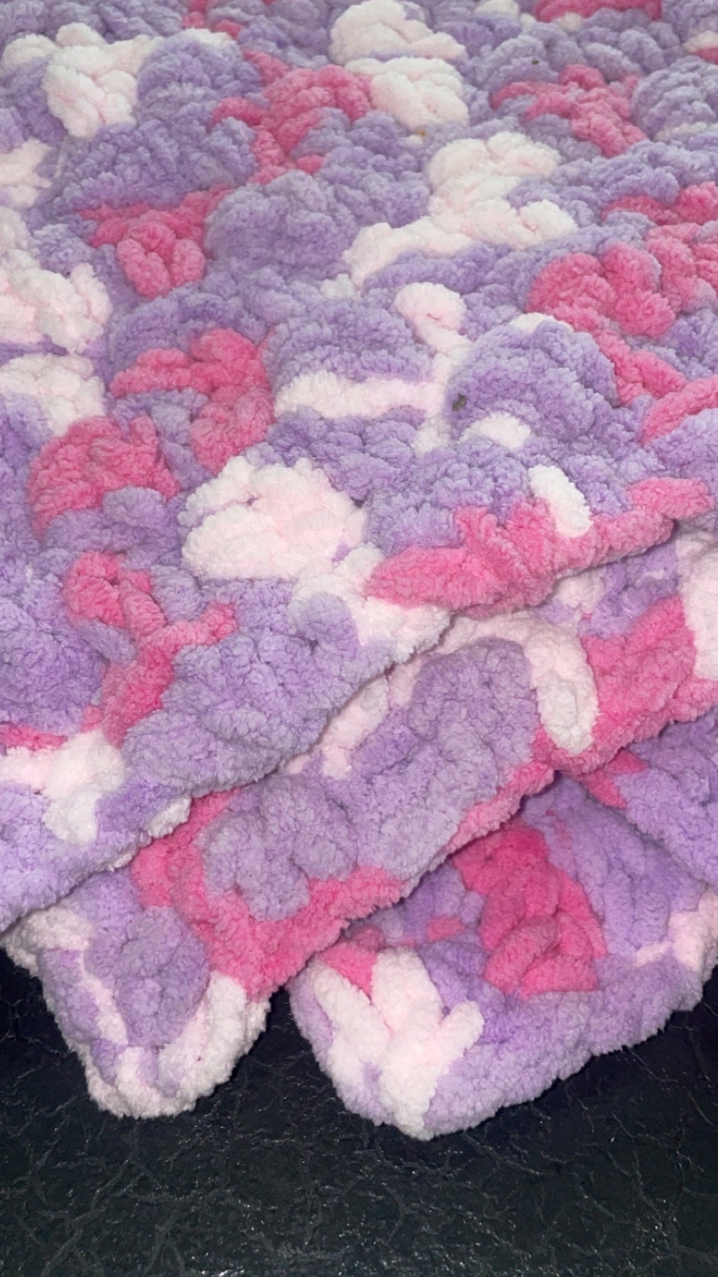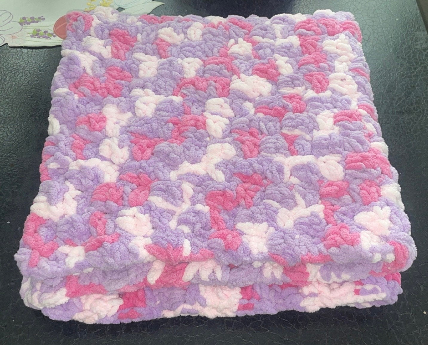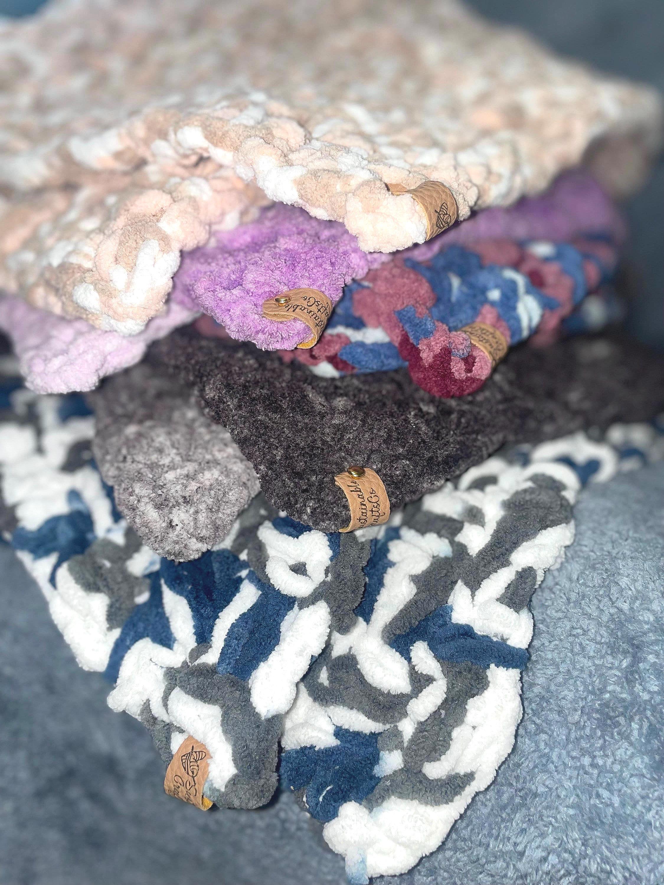 Crochet baby blanket made with super soft 100% polyester yarn! Perfect for a baby shower gift, or for your little one on the way! It is a mixture of purples and blues. Machine washable, air dry only. Is fast dying.