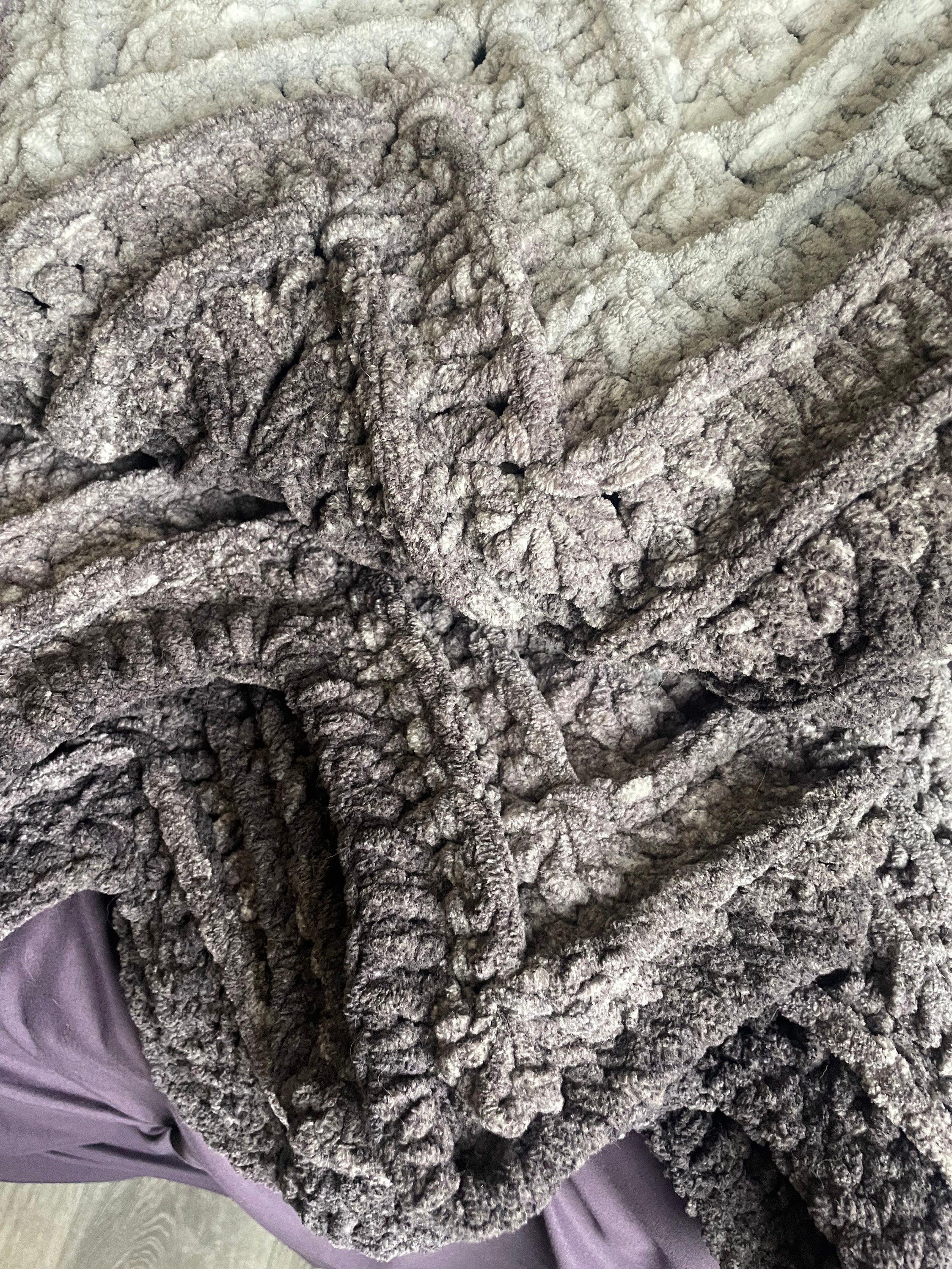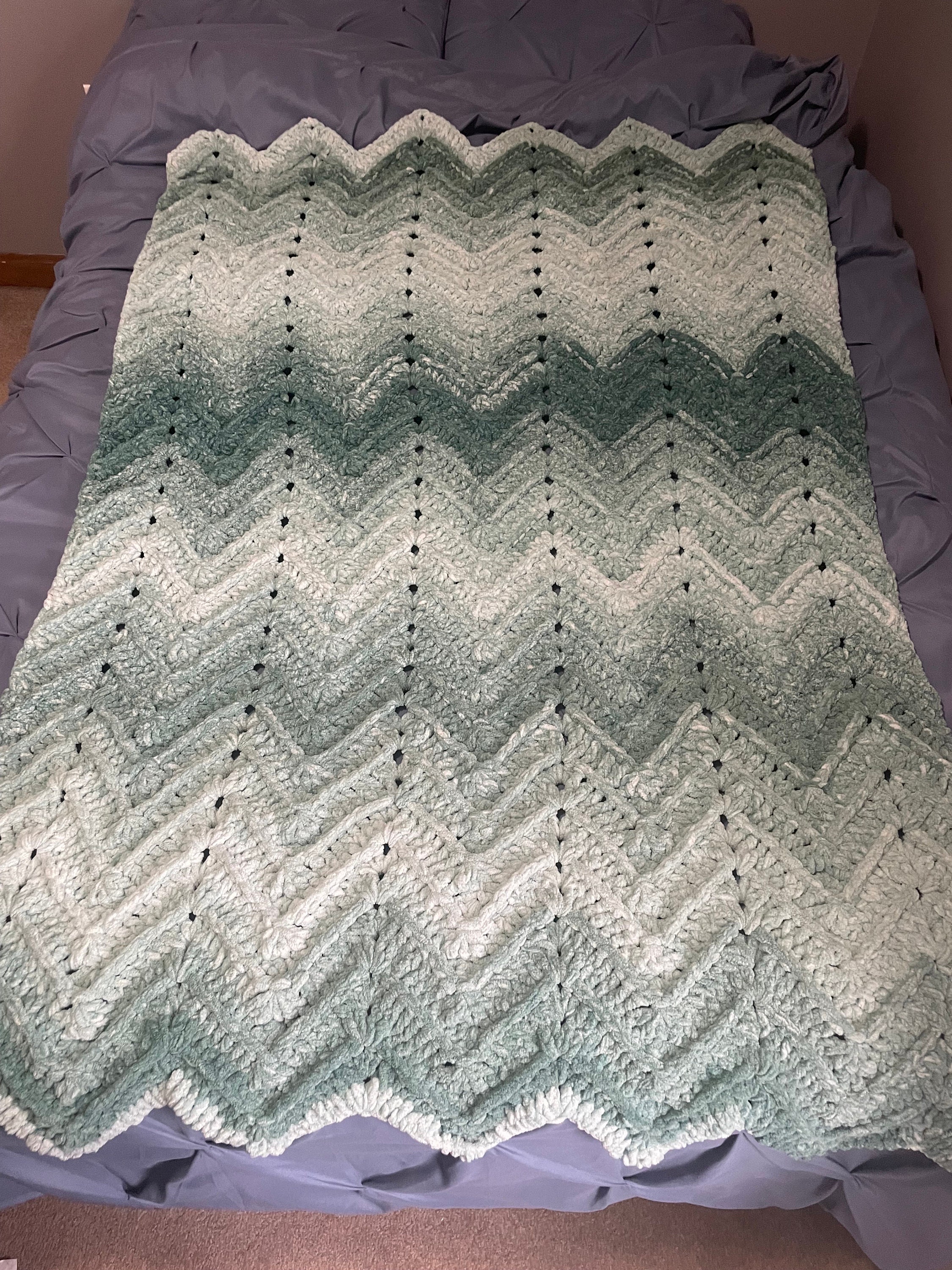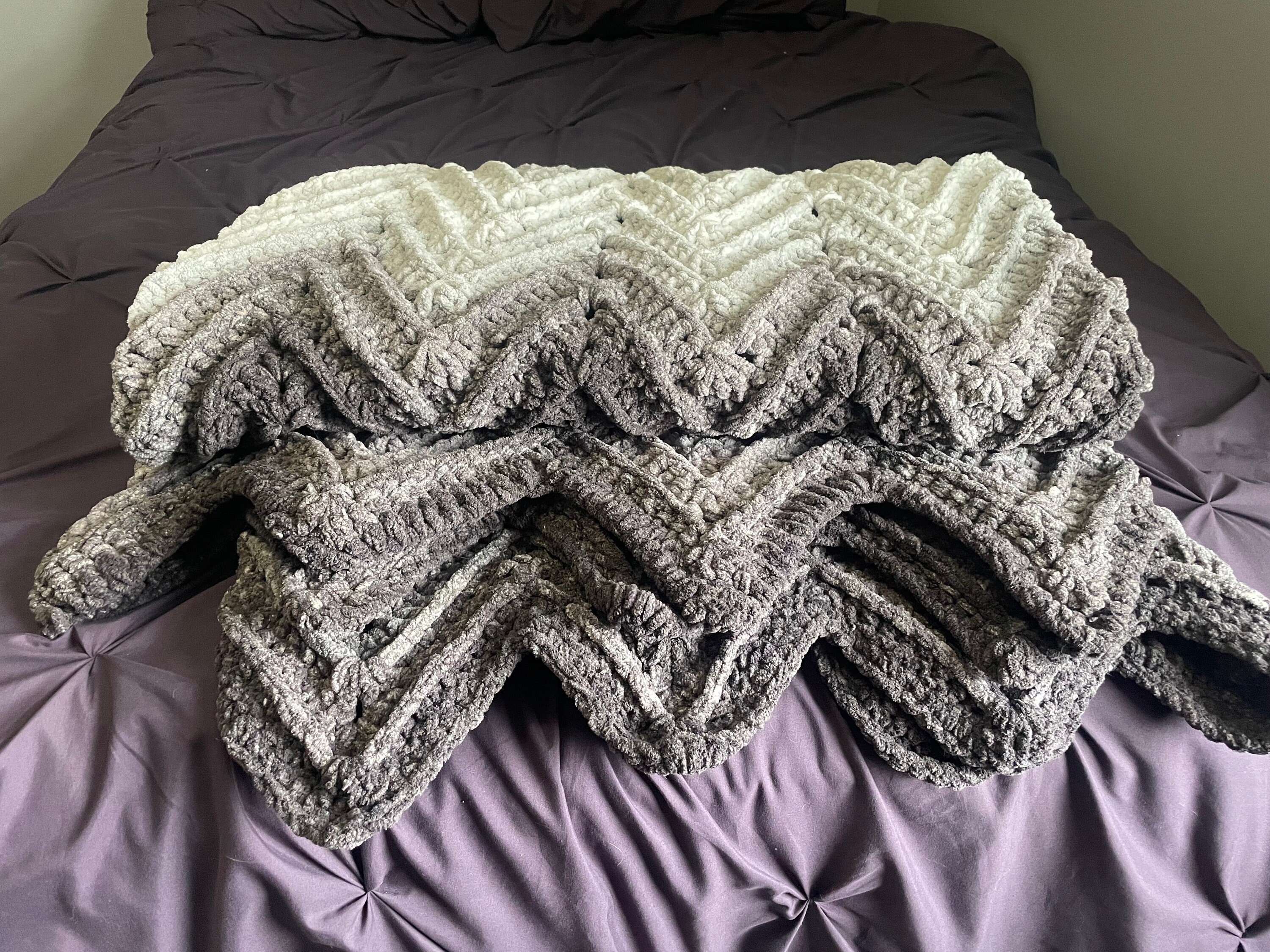 The ribbed ripple blanket is made with chunky weight yarn for a soft, warm and cozy feel. Perfect for wrapping up with on the couch, or in bed!