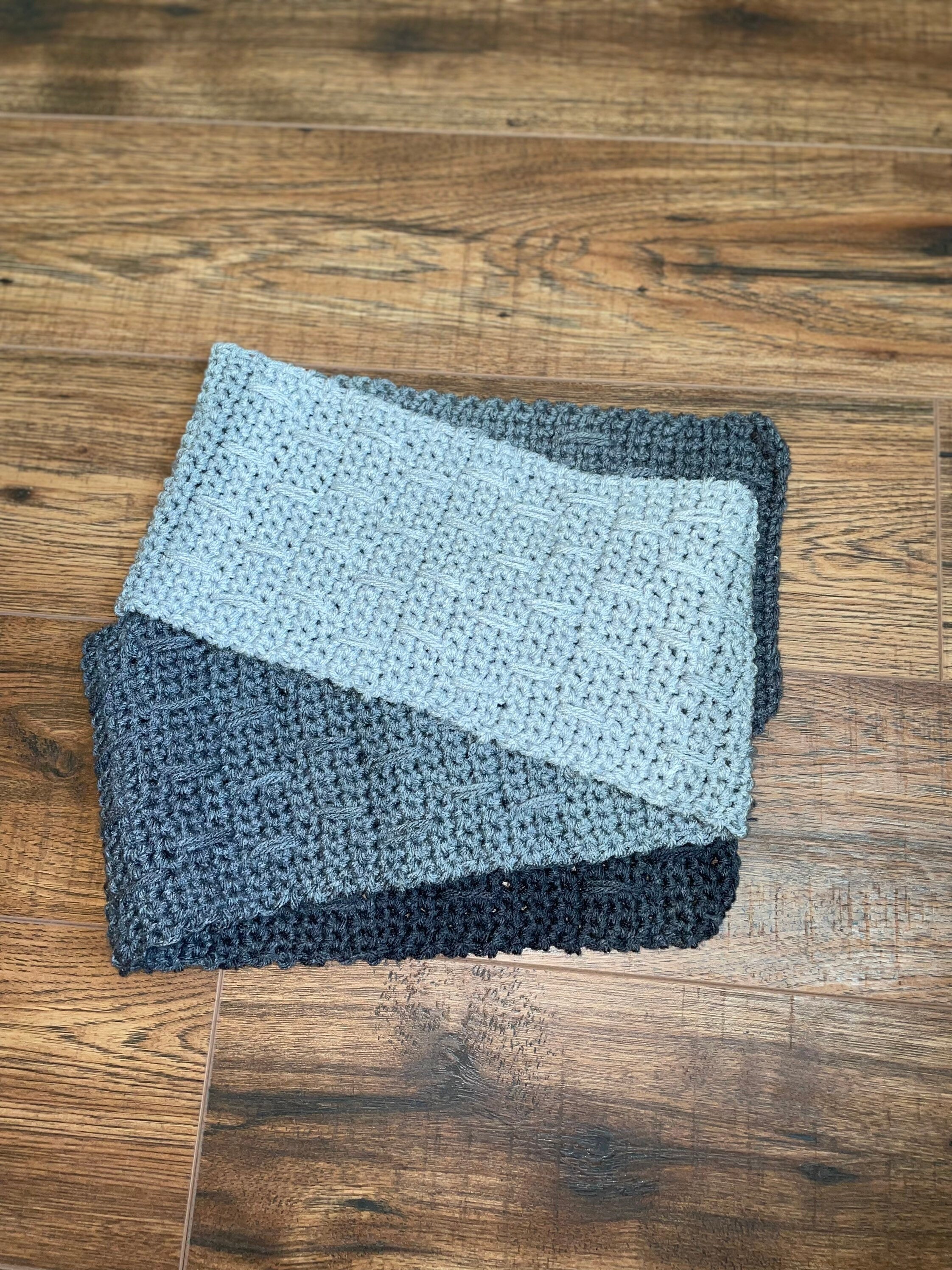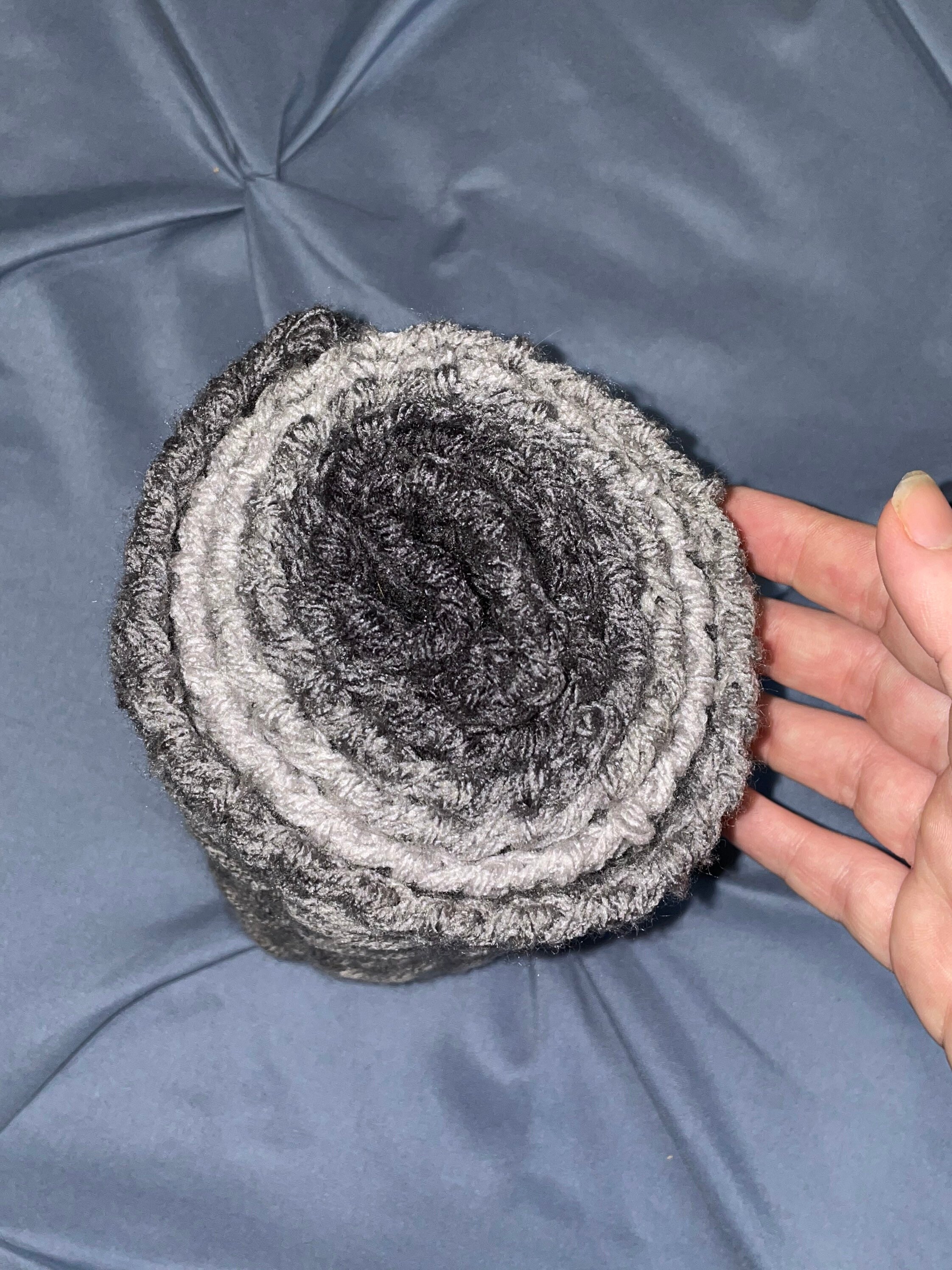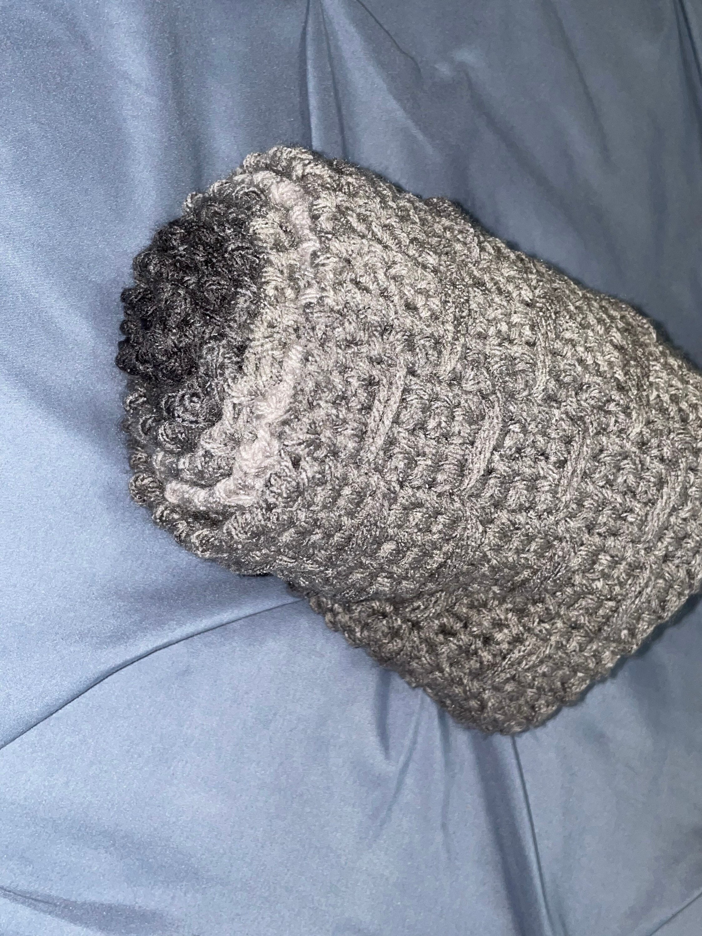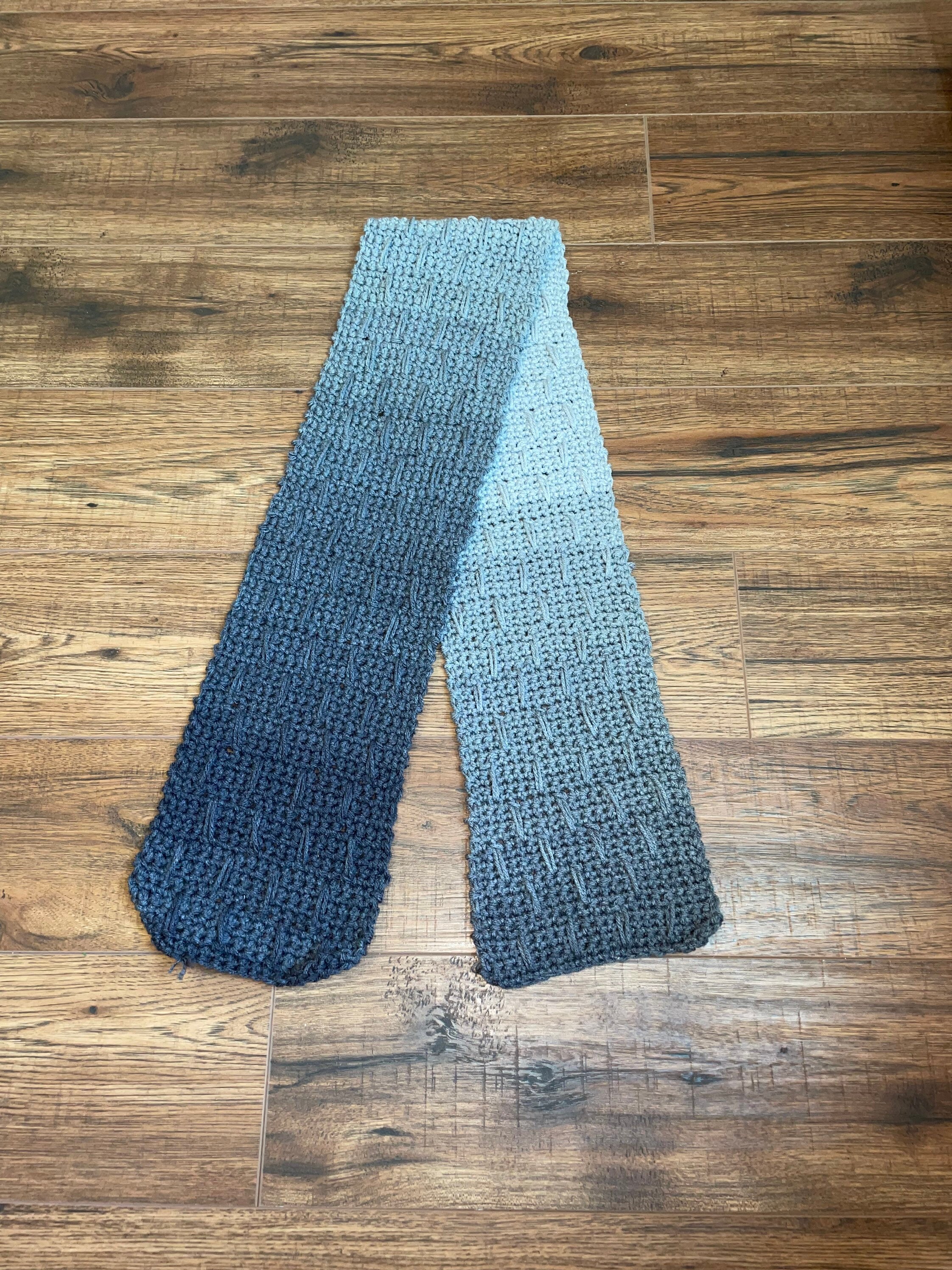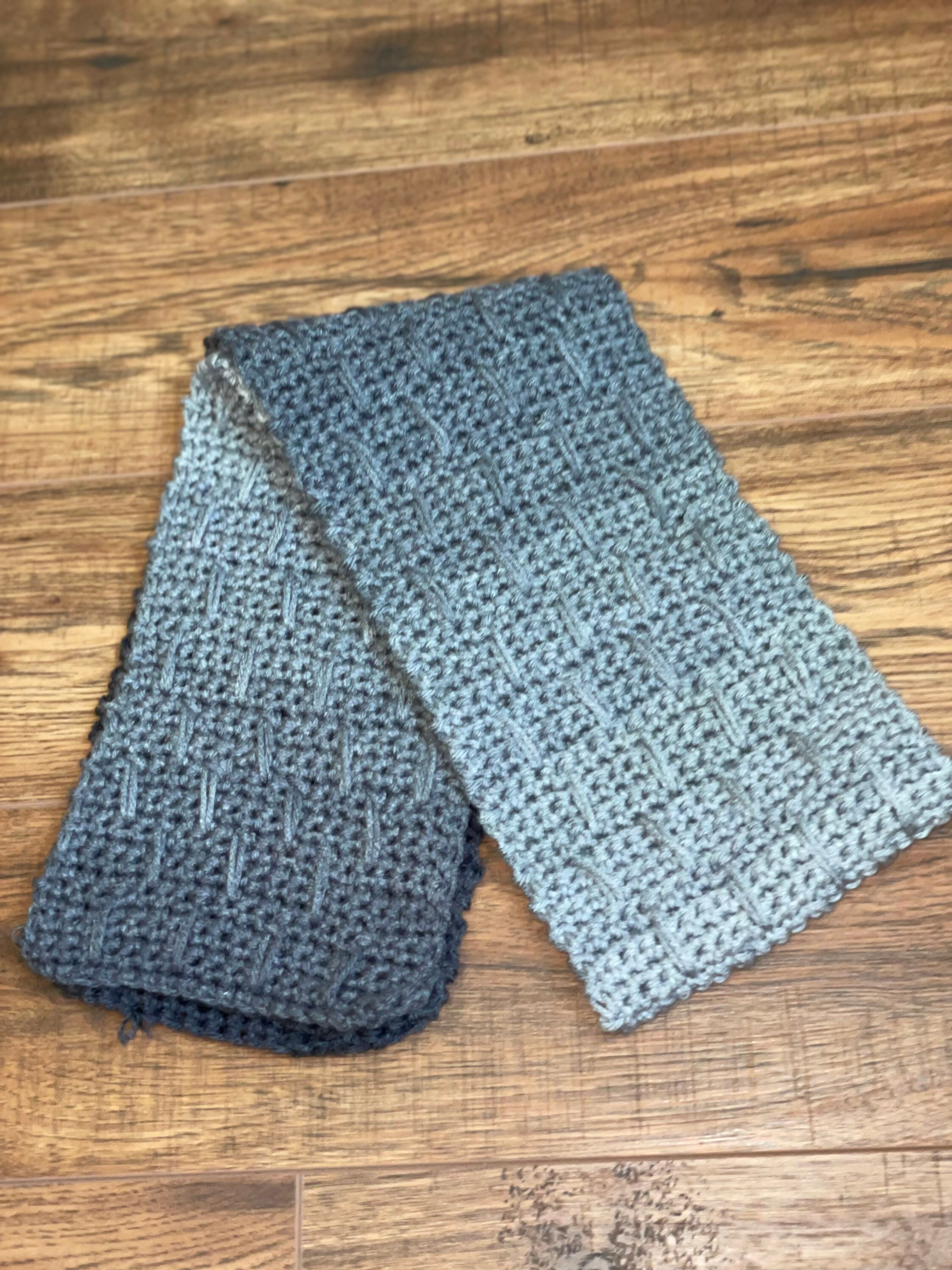 Greyscale ombré scarf for adults. Made from acrylic yarn which may be allergenic to people with sensitive skin. Machine washable, Air dry only.